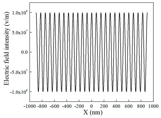 The propagating SPPs we employed are in the form of A0 × cos(ωt + 8 × pi × x), where the A0 is set as 0.001. (The propagation loss is neglected in simulation as the main purpose of the model is to analyze the movement of electrons under various conditions). The distribution of the electric field at the time of 628.27 fs is shown in Figure 4, which represents a standard sine wave used to approximate the propagating SPPs.