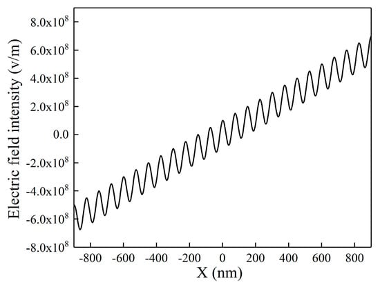 When the periodically distributed electrostatic field and the propagating SPPs are employed in the proposed model simultaneously, its electric field distribution is shown in Figure 5, when compared to Figure 2a and Figure 4, it becomes apparent that the electric field distribution represents the superposition of both the electrostatic field and the propagating SPPs.