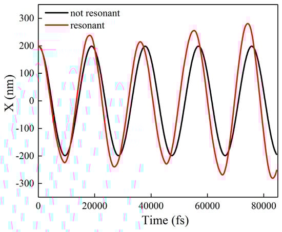 We fixed the frequency of the propagating SPPs and changed the magnitude of voltage, the numerical results show that the resonance occurs when the vibration frequency of electrons under an electrostatic field is the same as the oscillation frequency of SPPs, leading to an increase in the amplitude of the electron. As demonstrated in Figure 6, the oscillation amplitude of the same electron in the resonant state is significantly larger than in the normal state clearly demonstrating the resonance of the electron.
