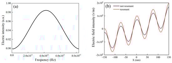 The electric field intensity at the position of 500 nm versus different frequencies of propagating SPPs is depicted in Figure 7a. The electric field intensity varies with the frequency of SPPs, and its intensity reaches a maximum at a frequency of 4.3 × 1011 Hz while the electrostatic field is fixed at 105 V/m. At this frequency, the intensity is enhanced by approximately 8%. The electric intensity will not vary with the frequency of SPPs if it is just the superposition of externally applied electric field with SPPs, which clearly indicates that resonance has occurred and the enhancement of light–matter interaction is achieved by the proposed structure. Figure 7b shows the electric field intensity as a function of the position in both the resonant state and the normal state. It becomes evident that the electric field intensity at the resonant state is larger than the normal state and the electric field intensity is obviously enhanced. These findings pave the way for enhancing the light–matter interaction and have great potential applications in the fields of optical modulation and sensing.
