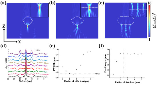 (a–c) The simulated electric field distribution of the non-uniform microlens array with different sizes of the side lenses, which are 1 μm, 2.5 μm, and 5 μm for (a–c), respectively. The insets are enlarged views of the PNJs. The vertical dashed white line represents the Z-axis, while the horizontal line denotes the X-axis. (d) The line profiles of the electric field along the horizontal lines shown in the insets in (a–c) for the non-uniform microlens array with various sizes of side lenses. (e) The relationship between the FWHM in (d) and the size of the side lenses. The dotted line represents the FWHM equals to 785 nm, and the asterisk represents the FWHM of the lens with different radius. The FWHM is narrowest (780 nm) when the side lens size is 2.5 μm. (f) The relationship between the focal length and the sizes of the side lenses, revealing that the focal length reaches the maximum when the side lens is 2 μm in diameter. The asterisk represents the focal length of the lens with different radius. The dotted line denotes the radius of side lens equals to 2.5 μm.
