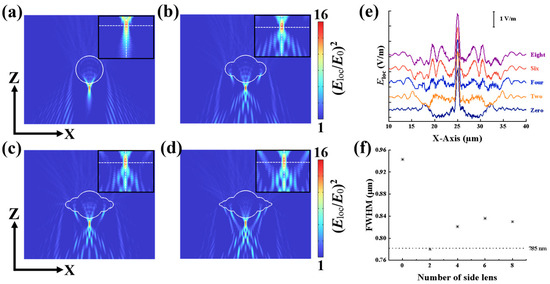 (a–d) The simulated distribution of the electric field corresponding to 0, 2, 4, and 6 side lenses, respectively. The horizontal and vertical white dashed lines are the central lines of the PNJ along the X-axis and the Z-axis. The insets are enlarged views of the electric field around the PNJs. (e) The line profile of the electric field along the horizontal white dashed lines shown in (a–d). (f) The relationship between the extracted FWHM in (e). When there are two side lenses, the FWHM reaches the narrowest value, which is 780 nm less than the incident wavelength of 785 nm, thus achieving a subwavelength resolution. The asterisk represents the FWHM of the lens with different number of side lens. The dotted line represents the FWHM equals to 785 nm.