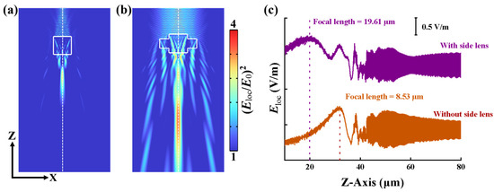 (a,b) The simulated electric field distribution of a (a) single rectangular microlens and a (b) non-uniform rectangular microlens array with side lenses. The white dotted line in (a,b) indicates the center of the microlens along Z-axis. (c) The line profile of the electric field along the white dashed line in (a,b). The purple dotted line in (c) represents the focal plane of the non-uniform rectangular microlens array, and the brown dotted line indicates the focal plane of a single rectangular microlens.