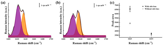 Comparison of the Raman spectra of 10 mM MB solution recorded using microlenses with (a) and without (b) side lenses. The Gaussian fitting of the spectra shows peaks centered at 1623 (purple) and 1633 cm−1 (orange). (c) represents the Raman peak areas at 1623 cm−1 and 1633 cm−1 in the Raman spectra recorded using the microlenses with (solid circle) and without (hollow circle) side lenses.