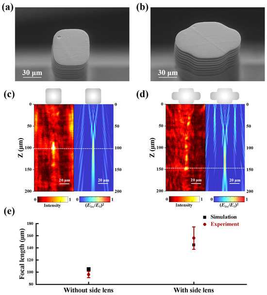 (a) SEM top view of the single microlens without side lenses. The scale bar is 30 μm. (b) SEM top view of the non-uniform microlens array. The scale bar is 30 μm. (c,d) Experimental electric field distribution (left) alongside the simulated electric field distribution (right) of (c) the single microlens and (d) the non-uniform microlens array, respectively. The white dotted line indicates the position of the focal plane based on the experimental results. (e) Comparison between the experimental focal length and the simulated values based on four repeated experiments.
