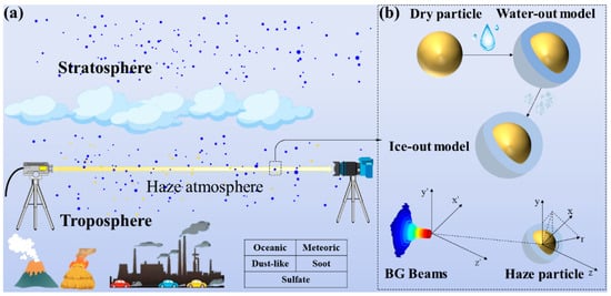 (a) Transmission schematic of BG beams in haze environment. (b) Ice-coated haze particles corrected model and schematic of BG beam particle scattering.
