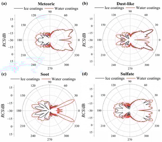 RCS of various haze particles with ice and water coatings under X-polarized BG beam irradiation: (a) meteoric-type particles, (b) dust-like particles, (c) soot particles, and (d) sulfate particles.