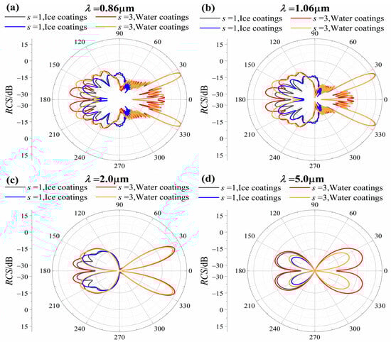 RCS of soot-type haze particles with ice and water coatings under linearly polarized BG beam irradiation featuring OAM modes s = 1 and s = 3: (a) λ = 0.86 μm, (b) λ = 1.06 μm, (c) λ = 2.0 μm, (d) λ = 5 μm.