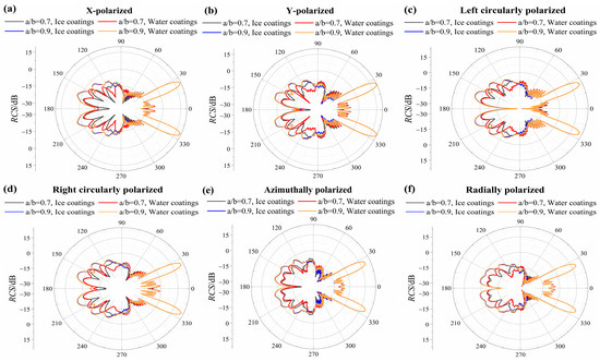 RCS of soot-type haze particles with ice and water coatings for various inner-to-outer diameter ratios (a/b = 0.7 and a/b = 0.9) under vector BG beam irradiation with different polarization states: (a) X-polarized, (b) Y-polarized, (c) left circularly polarized, (d) right circularly polarized, (e) azimuthally polarized, and (f) radially polarized.