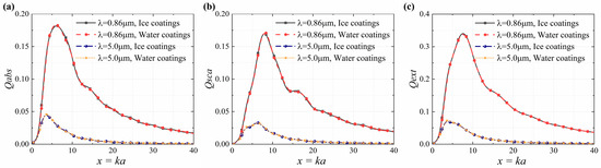 Efficiency factors of soot-type haze particles with ice and water coatings under X-polarized BG beam irradiation at wavelengths λ = 0.86 μm and λ = 5.0 μm: (a) absorption efficiency factor, (b) scattering efficiency factor, and (c) extinction efficiency factor.