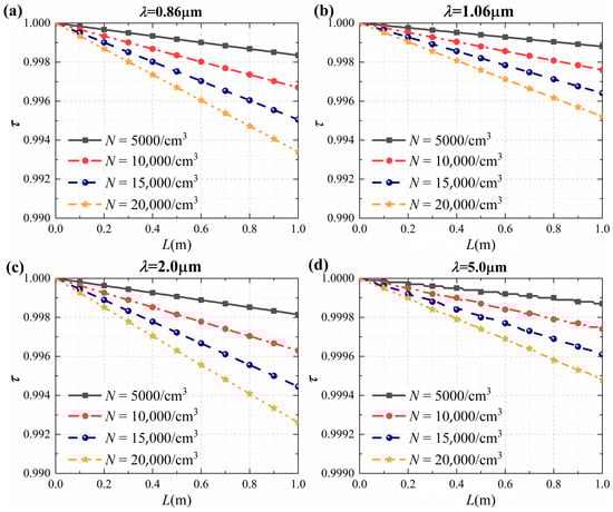 Transmittance of X-polarized BG beam at wavelengths λ = 0.86 μm (a), λ = 1.06 μm (b), λ = 2.0 μm (c), and λ = 5.0 μm (d) in soot-type haze environments with varying concentrations N = 5000, 10,000, 15,000, 20,000 cm−3.
