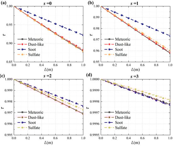 The transmission characteristics of X-polarized BG beams with various OAM modes (s = 0, 1, 2, and 3) propagating through haze environments composed of different particle types, including meteoric, dust-like, soot, and sulfate particles, are illustrated in Figure 7. Attenuation and scattering behaviors are influenced not only by the intrinsic properties of the particles (such as size, composition, and concentration) but also by the spatial energy distribution of the BG beam associated with each OAM mode.
