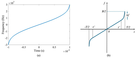Different NLFM signals can be obtained through different , such as the Hamming window. The SLR of the NLFM signal pulse, even after being compressed using the window function, remains suboptimal. To improve the SLR, we simulated the time–frequency characteristics of NLFM signals using the of the Hamming window, as shown in Figure 2a. The results demonstrate an “S”-shaped curve, with the curvature at both ends playing a crucial role in determining the pulse compression performance. Therefore, by adjusting the curvature at both ends of the “S” curve, NLFM signals can be tailored to meet specific application requirements, as shown in Figure 2b. This method is straightforward, easy to implement, and highly flexible, making it well-suited for diverse practical scenarios.