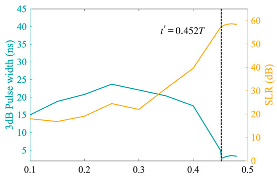 To further investigate the impact of the parameter on the pulse compression results, we conducted a simulation analysis. The simulation parameters included a probe pulse width 20 μs, a sampling rate of 1.25 GSa/s, and a sweep bandwidth of 60 MHz. The experimental results, depicted in Figure 3, demonstrate that within the interval , the optimal value of for achieving the highest possible SLR without incurring excessive broadening of the 3 dB pulse width was . And , .