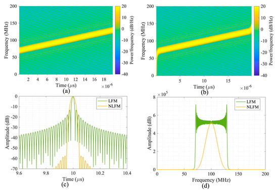 (a) Time–frequency spectra of LFM; (b) time–frequency spectra of NLFM; (c) compressed signals; (d) frequency spectra of LFM and NLFM.