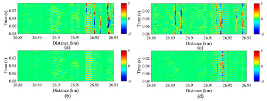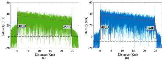 Figure 11 resents the power spectrum of the channel at the disturbance location. Figure 11a illustrates the case where the system employs NLFM probe pulses, showing that the disturbance signal at the fiber end achieved an SNR of 38.3 dB. Figure 11b depicts the system utilizing LFM probe pulses, where the disturbance signal at the same location exhibited an SNR of 26.4 dB. These results indicate that the NLFM-based system improved the SNR by approximately 11.9 dB compared to the LFM-based system at this specific position.