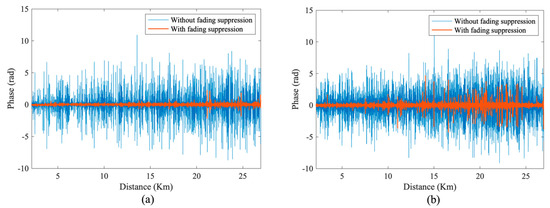 Furthermore, we employed phase weighting according to the intensity-weighted values of each carrier after matched filtering, followed by the application of the vector rotation aggregation method to combine the complex signals of the first-order carriers. After the implementation of fading suppression, the fading noise was notably reduced, as demonstrated by the red traces in Figure 8. Moreover, the fading suppression performance of the optimized NLFM signal system surpassed that of the conventional LFM signal system. In Figure 9, the phase demodulation results clearly exhibit a significant reduction in fading noise. Furthermore, it can be observed that the fading suppression performance of the LFM detection pulse system was noticeably inferior to that of the NLFM pulse system, further highlighting the advantages of NLFM pulse signals in mitigating fading noise.