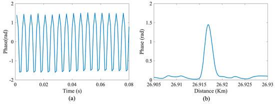 Figure 10a illustrates the results of phase demodulation for disturbance signals in the NLFM system, which effectively recovered the phase information. It also depicts the standard deviation (SD) of the phase around the vibration points, indicating the system’s precision. Notably, the measured distance between the rising and falling edges of the SD curve was approximately 2.7 m, which is consistent with the theoretical spatial resolution presented in Figure 4.