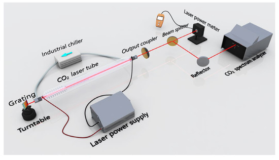 The CO2 laser is pumped by a high-voltage DC power supply that can generate a maximum output voltage of 45 kV and a maximum output current of 38 mA. A laser power meter (100F-CB-40, Cai Huang Thermoelectricity, Shenzhen, China) with a 40 mm diameter aperture was used to measure the CO2 laser output power. The measurable power range of the power meter is 100 mW–100 W, and the spectral range is 0.19–25 μm, the measurement accuracy is less than ±3%. The output line (wavelength) of the tunable CO2 laser was measured by a CO2 spectrum analyzer (16-A, Macken Instruments Inc., Calif, USA) with measurement range of 9.1–11.3 μm. An industrial chiller (model CW-5200, manufactured by Guangzhou Teyu Electromechanical, Guangzhou, China) is utilized to regulate and maintain the laser tube’s temperature with a high precision of ±0.3 °C.