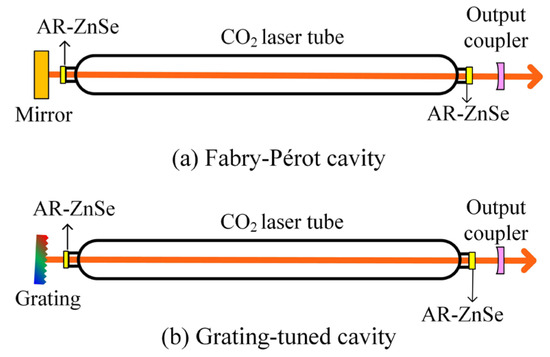 Figure 2b. The grating-tuned cavity belongs to the type of first-order oscillation and first-order output cavity. In both two cavities, the output transmittance can be changed by replacing the different flat–concave ZnSe plate with a different transmittance. For both cavity setups, the output transmittance can be adjusted by replacing the flat–concave ZnSe plate with one of varying transmittance levels.