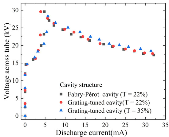 Figure 3, for the three configurations, the volt–ampere curve profiles of the laser tubes used are almost identical. When the voltage is lower than 14.6 kV, the discharge current is almost zero, the CO