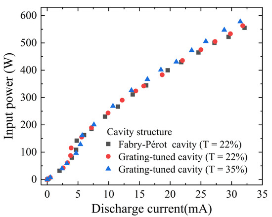 Figure 6 shows the output power at the line of 10P20 (10.59 µm) versus the discharge current under different output couplers. It can be seen that the output power increases rapidly with the increasing of discharge current when the discharge current is relatively smaller and then gradually tends to saturate. The phenomenon of output power saturation at high discharge currents can be explained by three primary factors. Saturation of Upper Energy Level Particles: As the discharge current increases, the number of CO