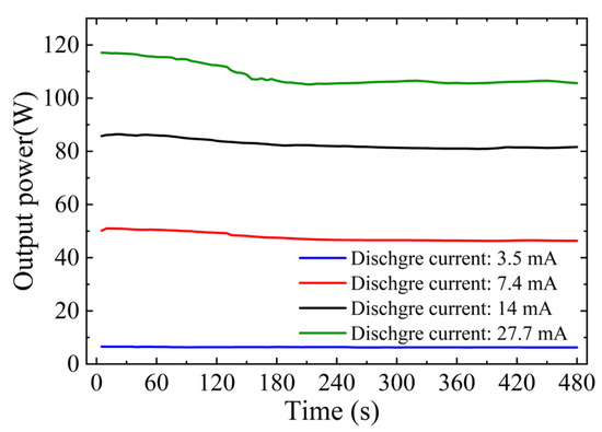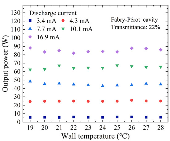 Figure 5. The data revealed that within the specified temperature range, the laser output power remained stable at approximately 5.8 W and 25.7 W for the lower discharge currents of 3.4 mA and 4.3 mA, respectively. At a high discharge current of 16.9 mA, the laser output power exhibits greater fluctuations, with a maximum of 88.1 W and a minimum of 81.9 W within the wall temperature range of 19–28 °C. During the experiment, it is challenging to maintain constant laser tube wall and ambient temperatures, which may introduce variability in accurately determining the correlation between wall temperature and output power. However, this variability can be considered a reasonable margin of error within the experimental process.
