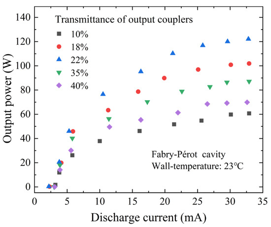 When the output transmittance is about 22%, the laser output power increases the fastest with the discharge current and has a higher laser conversion efficiency. For a given gain coefficient, there exists an optimal output coupling rate at which the output power reaches its peak, and 22% is close to the optimal output coupling rate. A maximum CO2 laser power output of about 122 W was obtained at the discharge current of about 32.8 mA and injected electric power of about 570 W, and the corresponding conversion efficiency is about 21.4%.