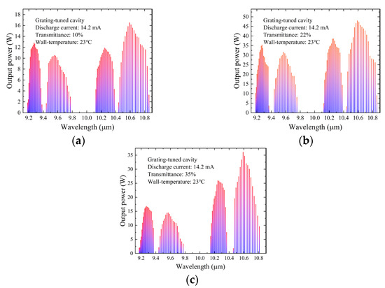 Figure 8, within the wavelength range of 9.17–10.86 μm, the tunable output spectral lines of about 80, 78, and 74 lines were obtained under the output transmittance of 10%, 22%, and 35%, respectively. In addition, in terms of the laser output power distribution on the four branches of 9R, 9P, 10R, and 10P, there is a small difference under low output transmittance of 10% or 22%. However, as the output coupler transmittance increased, at a higher output transmittance of 35%, the differences among these branches became progressively larger. When the output transmittance of the output coupler was 10%, 22%, and 35%, the maximum output line is the 10P20 (10.59 µm) and the power is about 16.5 W, 48.1 W, and 36.1 W, respectively.