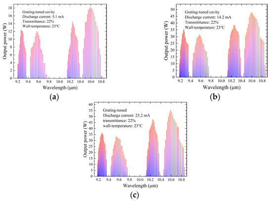 Figure 9, within the wavelength range of 9.17–10.86 μm, the tunable output spectral lines of about 74, 78, and 78 lines were obtained under the discharge current of 5.1 mA, 14.2 mA, and 25.2 mA, respectively. Compared to the discharge current of 5.1 mA, the discharge current of 14.2 mA resulted in an additional output of four spectral lines. Under the grating tuning regime, many lines of the CO