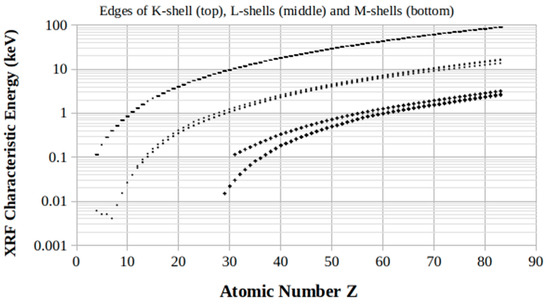 Figure 1 displays the distributions of K-, L-, and M-shell edges energy values for all the elements whose atomic number Z ranges between 4 and 83. Data have been arranged from [1].