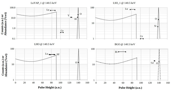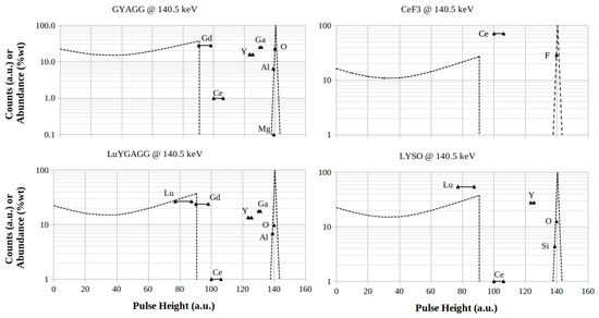 LuYAP, LSO, LHO, and BGO footprints for 140.5 keV photon energy. The logarithmic scales are in counts (a.u.) for both the Compton profiles and the full-energy peaks, while they are in %wt for the element abundances in the mixtures, respectively.