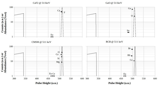 CaF2, GaO, CMSM, and RCB footprints for 511 keV photon energy. The logarithmic scales are in counts (a.u.) for both the Compton profiles and the full-energy peaks, while they are in %wt for the element abundances in the mixtures, respectively.