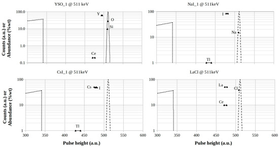 YSO, NaI, CsI, and LaCl footprints for 511 keV photon energy. The logarithmic scales are in counts (a.u.) for both the Compton profiles and the full-energy peaks, while they are in %wt for the element abundances in the mixtures, respectively.