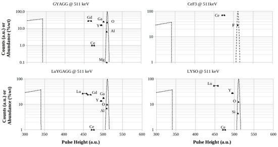 With the exception of YSO, Figure 3 shows a certain presence of triangles in the valleys between Compton edges and full-energy peaks due to XRF-emissions from elements with Z > 50.