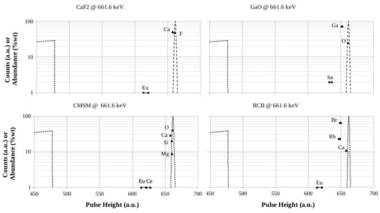 CaF2, GaO, CMSM, and RCB footprints for 661.6 keV photon energy. The logarithmic scales are in counts (a.u.) for both the Compton profiles and the full-energy peaks, while they are in %wt for the element abundances in the mixtures, respectively.