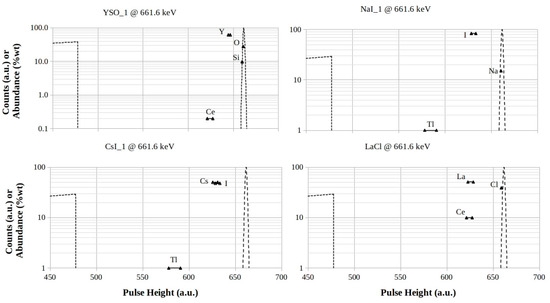 YSO, NaI, CsI, and LaCl footprints for 661.6 keV photon energy. The logarithmic scales are in counts (a.u.) for both the Compton profiles and the full-energy peaks, while they are in %wt for the element abundances in the mixtures, respectively.