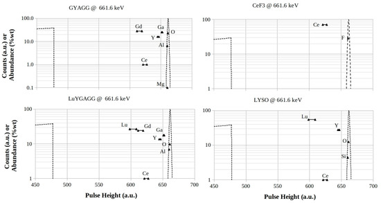 GYAGG, CeF3, LuYGAGG, and LYSO footprints for 661.6 keV photon energy. The logarithmic scales are in counts (a.u.) for both the Compton profiles and the full-energy peaks, while they are in %wt for the element abundances in the mixtures, respectively.