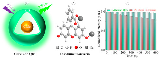 Figure 1. (a) Schematic structures of CdSe/ZnS QDs. (b) Chemical structures of organic dye, disodium fluorescein. (c) Normalized fluorescence intensity of the same concentration of QDs and disodium fluorescein varied with time. The pump power was fixed at 5 mw.
