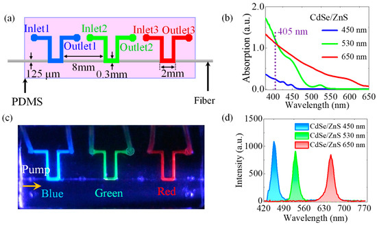 Figure 3. (a) The schematic design diagram of the PDMS optofluidic device for a red–green–blue three-color fluorescent light source. (b) The absorption of CdSe/ZnS QDs with different emission wavelengths. (c) Image of the red–green–blue three-color fluorescent light source in operation. (d) The spectra of fluorescence emission of the broadband light source from different channels. The blue, green, and red shades are the fluorescence spectra of CdSe/ZnS QDs (emission wavelengths of 450 nm, 530 nm, and 650 nm) with a concentration of 5 µM, respectively.