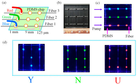 Figure 4. (a) The design diagram for a 3 × 3 fluorescence array. The red, green, and blue pipes represent the 450 nm, 530 nm, and 650 nm CdSe/ZnS QD solution injections, respectively. (b) Photograph of PDMS chip with 3 × 3 fluorescence array. (c) Photograph of RGB fluorescence emission by using a 3 × 3 fluorescence array. (d) Photograph of a fluorescence display prototype showing “YNU” based on a 3 × 3 fluorescence array.