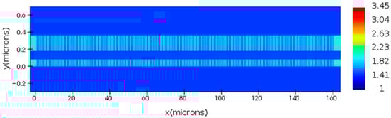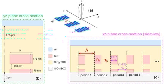 The simplest GC configuration in terms of design and fabrication complexity is a uniform GC where the geometrical parameters (filling factor (FF), width, pitch (Λ)), chosen for optimal performance, remain constant throughout the GC length. The effective index of the grating (neff−grating), given by (1), is also constant across a uniform design. Uniform GC configurations were investigated and simulated in this study. A top view of the uniform grating is shown in Figure 3.