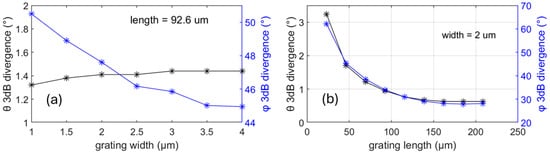 For the design proposed in this paper, an FF equal to 0.5 was chosen. The next parameter that was investigated was the width. The nominal width in this platform is 1.1 μm, and its minimum value for the proper confinement of the mode in the waveguide is 700 nm. Hence, width values greater than 1 μm were investigated. The waveguide width affects the light confinement within the waveguide in the lateral dimension. At the same time, large width values increase the required distance (d) between adjacent GCs (shown in Figure 1) in the OPA to avoid evanescent-field coupling and crosstalk between the OPA channels. Lastly, as the width increases, we enter the multimode regime, which should be avoided. Therefore, a study of the width impact on the OPA performance (angle divergence) is necessary to optimize its value. To this end, 3D-FDTD simulations were performed, varying the waveguide width between 1 μm and 4 μm with a step of 0.5 μm while keeping the other parameters constant (length = 92.6 μm, FF = 0.5). The simulated θ and φ angle 3 dB divergences are shown in Figure 4a. These results indicate that as the width increases, the φ divergence decreases (10.4% decrease for a width variation between 1 and 4 μm), while θ divergence is monotonically affected (9% increase for a width variation between 1 and 4 μm). Since the θ divergence is close to 1°, this translates to 0.1° of change, which is considered small in terms of absolute value for the application. Taking into account the aforementioned limitations and to ensure that the spacing requirements in the OPA structure remain reasonable, a width of up to 2 μm should be chosen.