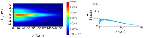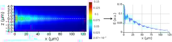 (Left): Top view of the emission profile of the uniform grating for a width of 2 μm and a length of 100 μm. The Ez component field distribution is shown with a color scale. (Right): A 1D plot of the emission profile along the dashed line of the left figure.