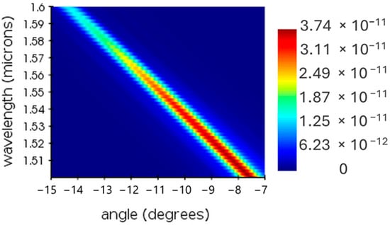 Having defined all the geometrical parameters of the GC, a 3D-FDTD simulation of the selected configuration was performed with the Ansys Lumerical 2023 R2.3 FDTD solver. Figure 12 illustrates the emission profile of the proposed non-uniform grating. It is observed that the emission profile is more uniform than the uniform design. Figure 13 shows the θ angle wavelength sensitivity for a pitch of 926 nm, revealing a steering angle of 7°/100 nm.