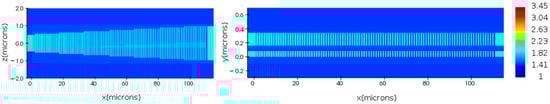 Lastly, the pitch is freely chosen according to (2) to achieve the desired emission angle. For an emission angle of around −10°, which is a typical value for radiators, the pitch is set to 926 nm. These values result in the optimal performance of the uniform grating while minimizing the θ and φ angle divergences. A 3D-FDTD simulation was repeated with the selected geometrical parameters. The top view and sideview of the simulated emission profile of the grating are shown in Figure 5. The extracted θ and φ angle divergences are 0.9° and 32°, respectively. It is worth noting that the φ divergence is large because these simulations do not take into account the complete OPA structure but only the single radiator element.