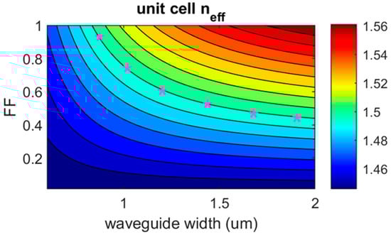 The design process started with FDE simulations using the Ansys Lumerical 2023 R2.3 MODE solver. First, the effective index of the fundamental TE mode of a waveguide cross section (n1), varying its width, is calculated given the ADS TriPleX layerstack. The results are shown in Figure 8. In the ADS TriPleX platform, to create the grating teeth, the Si3N4 is fully etched, removing both layers of the Si3N4 layerstack that are illustrated in Figure 2b. Therefore, the etched part of the grating geometry consists of SiO2. Since there is no waveguiding material in the etched part and the FDE solver cannot calculate any supported modes, we assumed the value of the effective refractive index of the etched part (n0) to be equal to the value of the refractive index of SiO2 (nSiO2). Using (1) and the calculated n1 values, it is then possible to compute the neff−grating for the different width and FF combinations. This is shown in Figure 9.