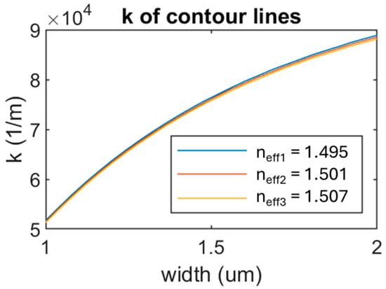 A second criterion for choosing the contour line is the k value. Although between the different contour lines, the k values are similar, we see from Figure 10 that k shows a larger variation in the 1–1.5 μm width range, compared to the 1.5–2 width range. Therefore, there is a tradeoff between having a larger k variation and an acceptable width size. All things considered, the contour line that best fits all the criteria is marked with pink stars in Figure 9 and has neff−grating = 1.495.