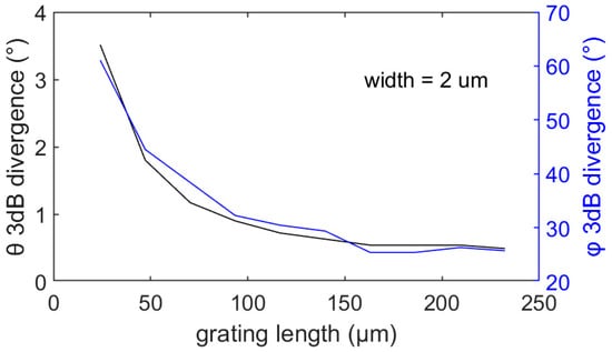 As a second step, the effect of the GC length variation is studied to optimize its value. Three-dimensional FDTD was performed, this time varying the GC length between 25 μm and 200 μm while keeping the width constant at 2 μm and the FF at 0.5. The resulting simulated θ and φ angle 3 dB divergences are shown in Figure 4b. We observe that both the θ and φ divergences are reduced as the length increases. For a length of 92.6 μm, the θ divergence is 0.94°, while the φ divergence is 33.92°. For lengths longer than 160 μm, the divergence values start to converge. For a length of 208 μm, values for the θ and φ divergences as low as 0.63° and 28° can be achieved. This signifies a θ and φ divergence reduction of 81% and 55.5%, respectively, for the investigated length increase from 25 μm to 200 μm.