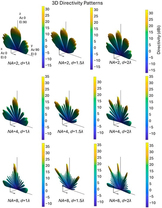3D directivity plots (in dBi) produced with the Sensor Array Analyzer app, varying the number (NA) of grating elements and the distance (d) between them. The axis information is mentioned in the first subplot and is the same for all the subplots. The colorbar shows the directivity in dBi.